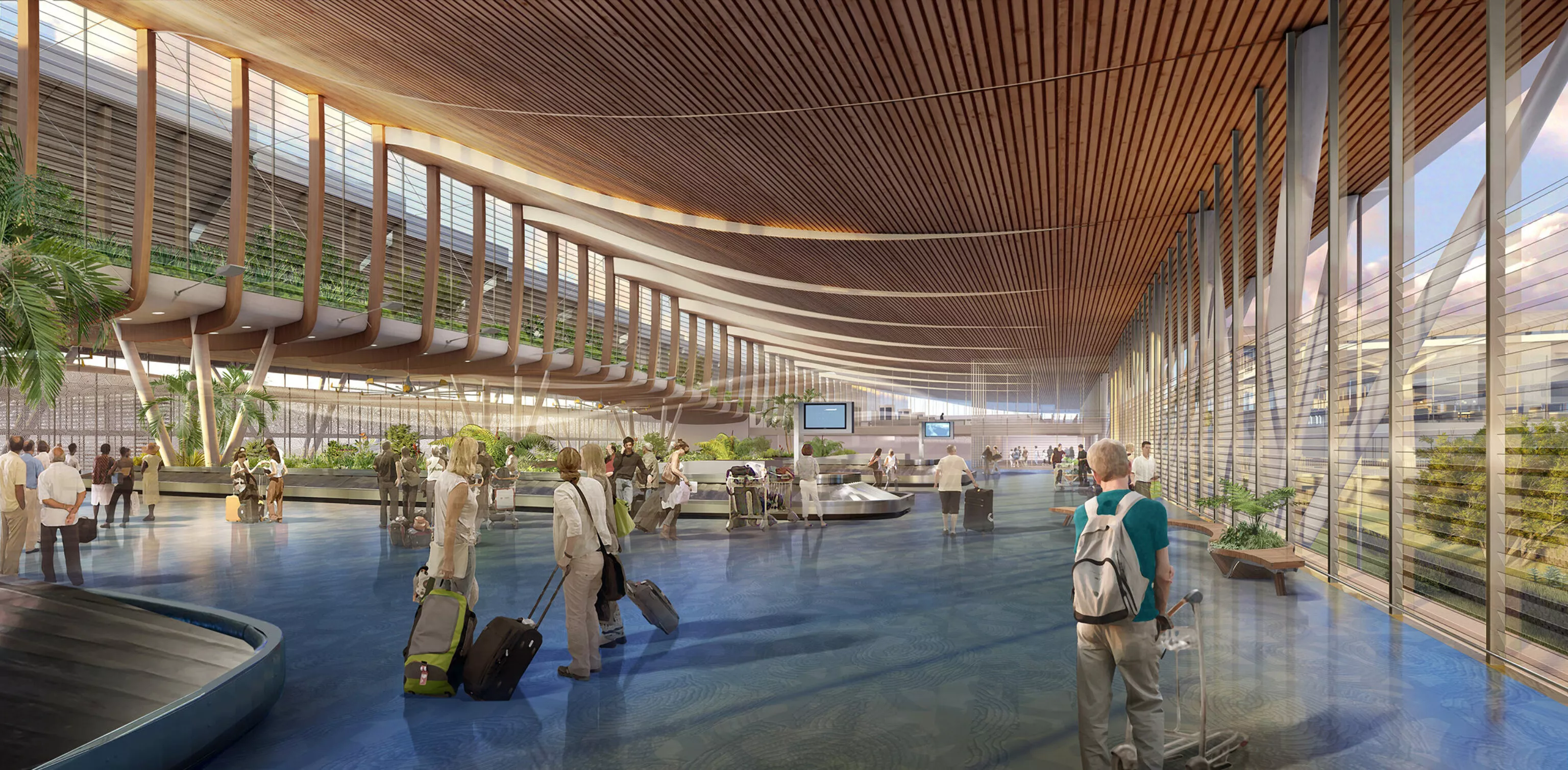 To achieve this, the facade is being redesigned with metal extensions on the exterior and a new framework inside. A new circulation axis is also created to direct passengers to the new arrival hall, and the airport extension includes the diversion of an adjacent street. The reception area will benefit from natural ventilation due to a redesign of the roof shape, which facilitates the capture of marine breezes from the area.